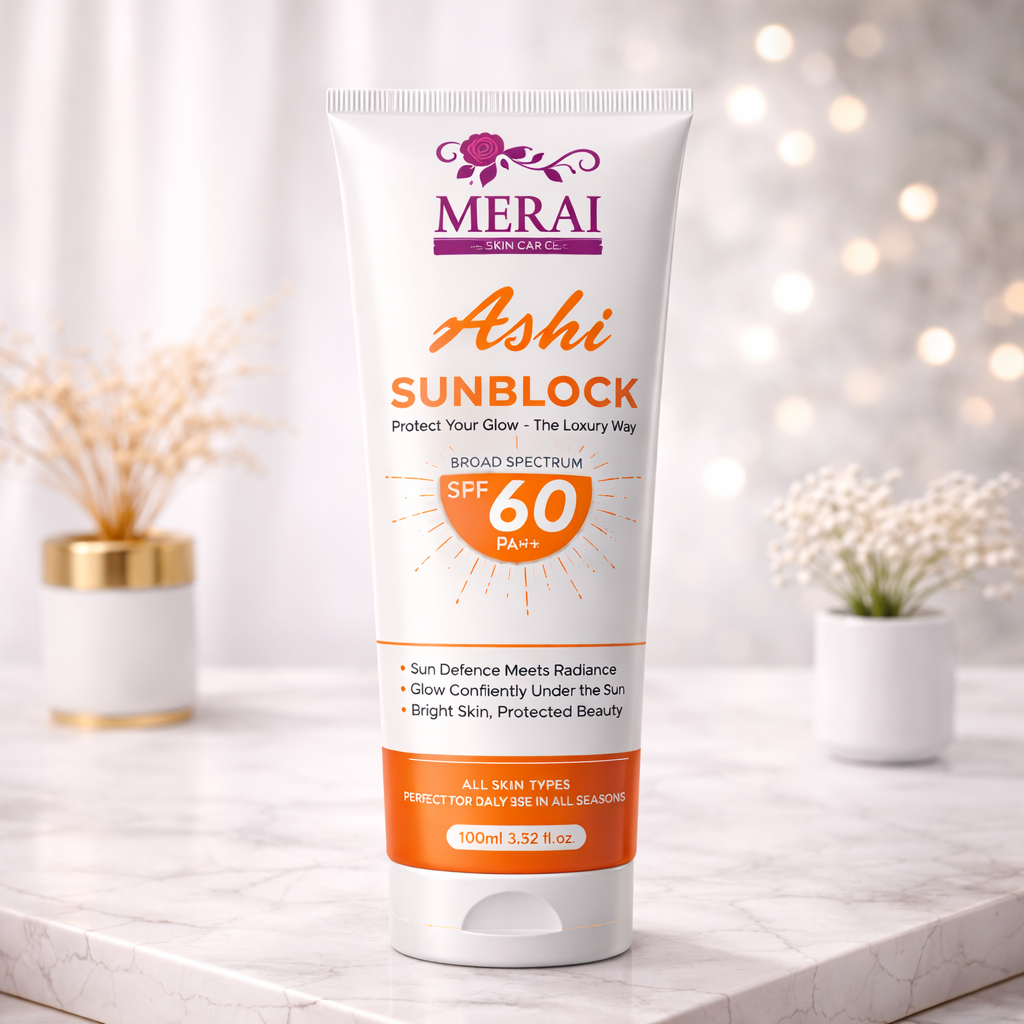 Ashi Sunblock SPF 60+ is a high-performance, luxury sunblock designed to protect your skin from harmful UVA & UVB rays while keeping it fresh, smooth and glowing. Its advanced formula helps in preventing tanning, sunburn, dark spots, and premature aging.